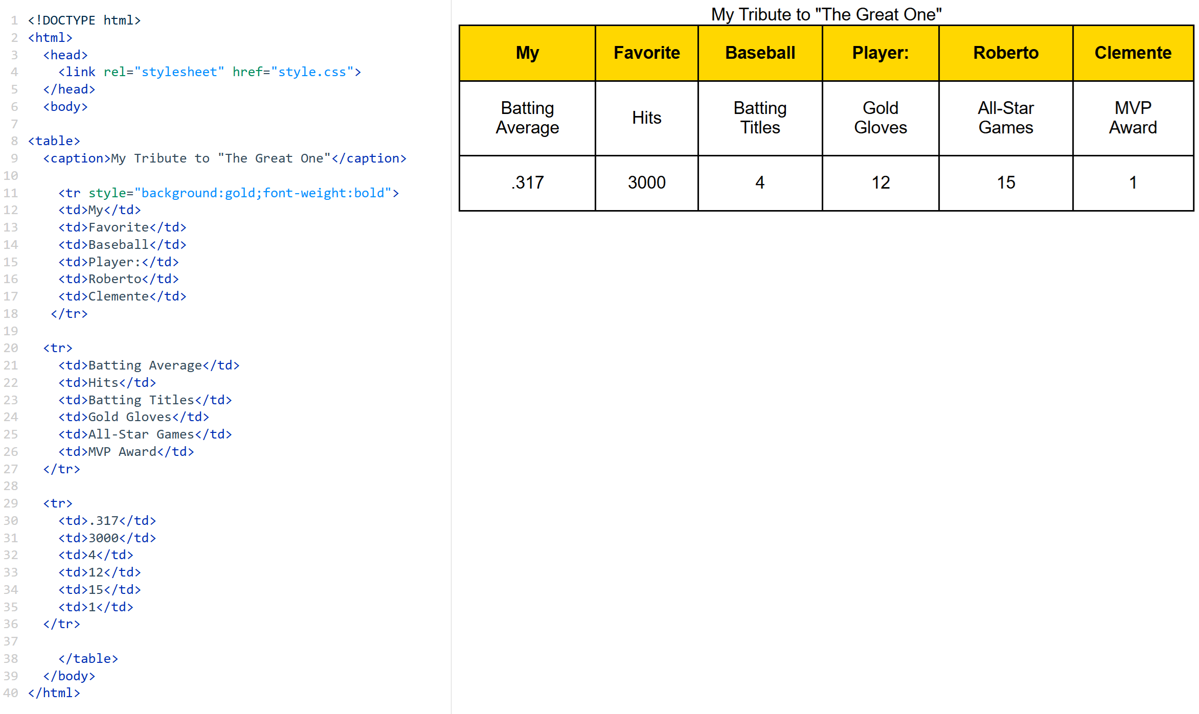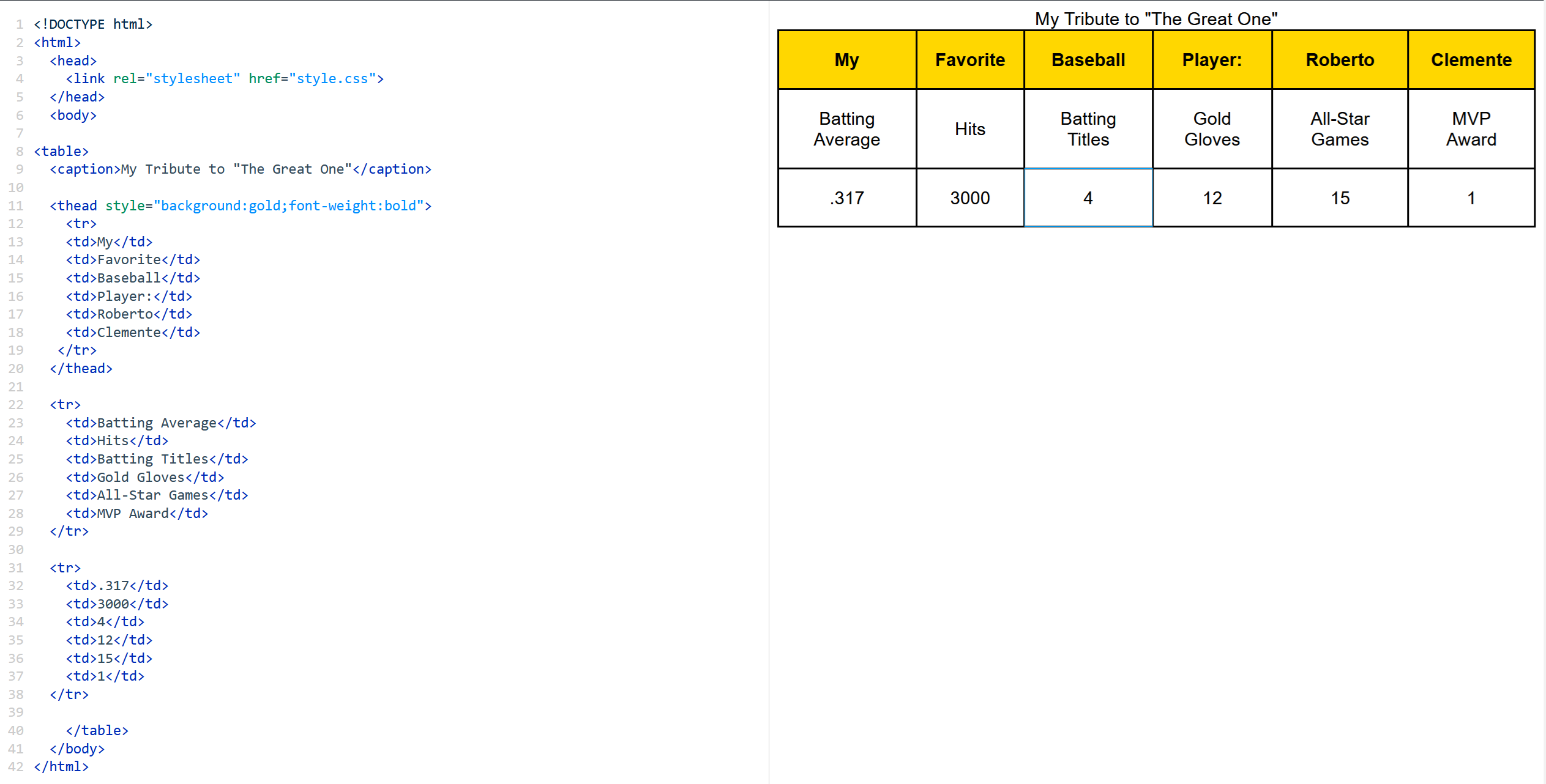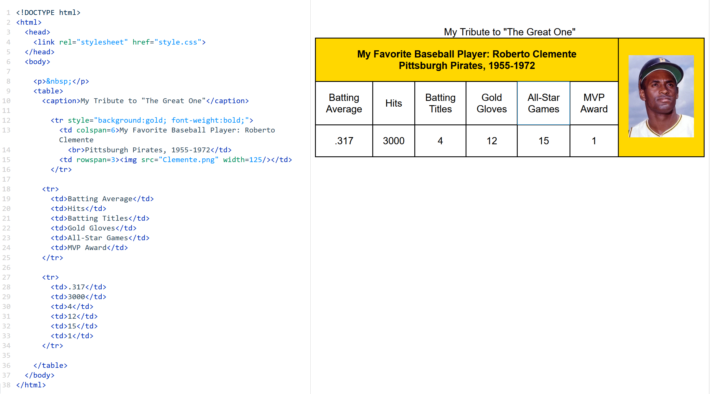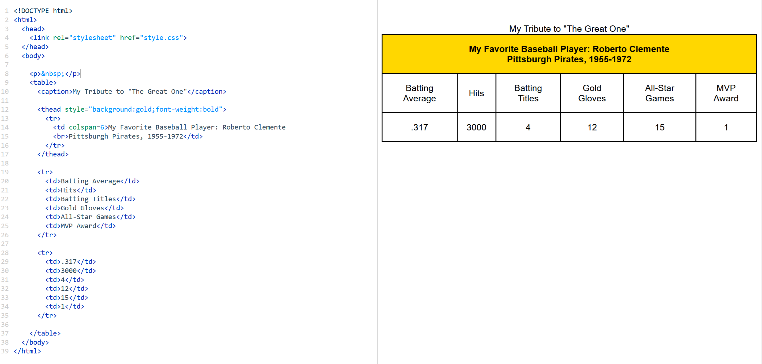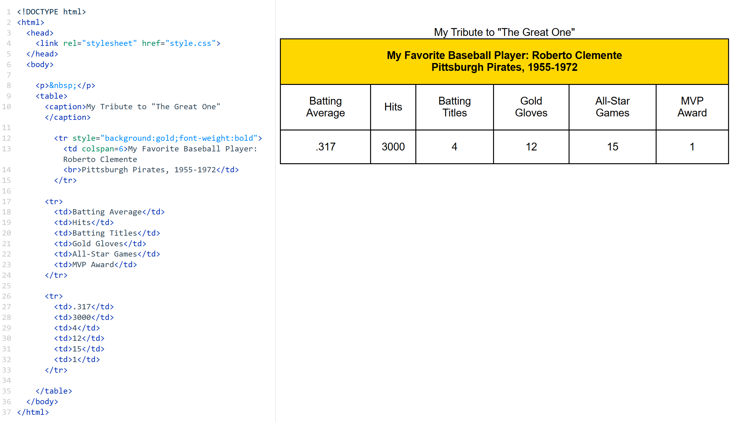 III. We can make the table more interesting by adding a photo of Roberto Clemente. We can add the photo to the table using 'rowspan'. In the example below, note how 'rowspan' is used to allow the cell holding the photo to span 3 rows.